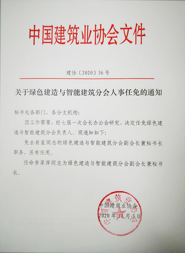 中國建筑業協會關于綠色建造與智能建筑分會人事任免的通知