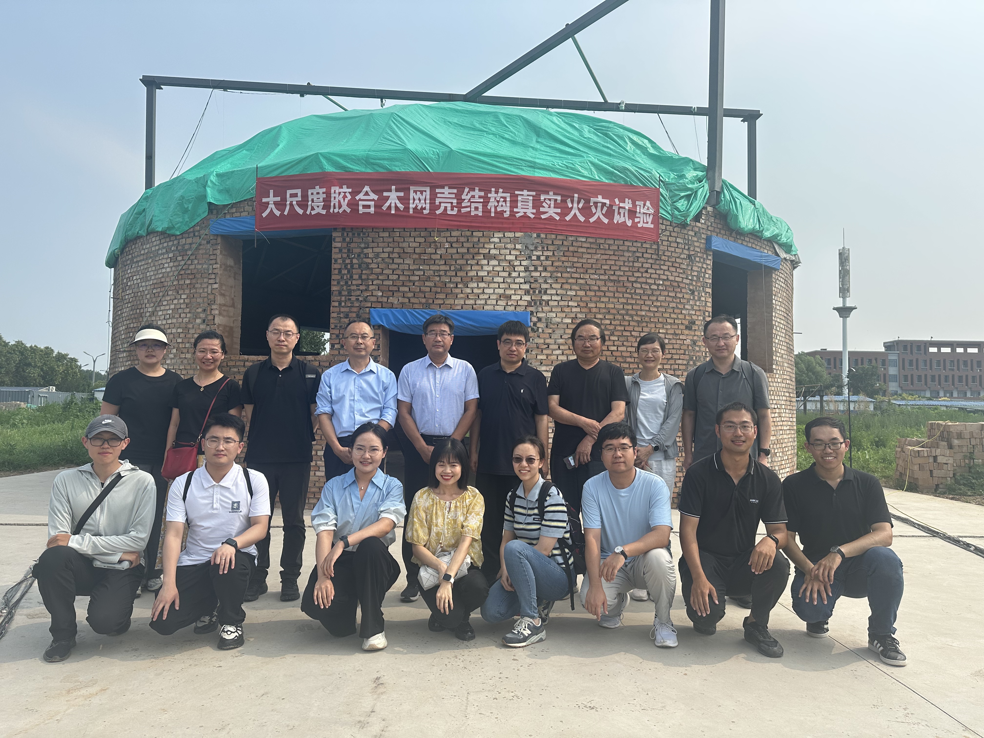 會后,編制組專家在河北工程大學現場觀摩了大尺度膠合木單層網殼真實火災破壞性試驗。此次試驗為膠合木空間網格結構的抗火性能研究提供了關鍵數據支撐,將推動膠合木結構的工程應用。