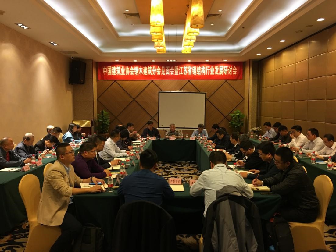 2020年10月14日至15日,由中國建筑業協會鋼木建筑分會、江蘇省建筑鋼結構混凝土協會與江蘇省建筑業協會共同主辦,江蘇新藍天鋼結構有限公司承辦的江蘇省鋼結構行業發展研討會在南京召開。中國建筑業協會鋼木建筑分會高級顧問劉哲、常務副會長黨保衛、副秘書長劉民,江蘇省建筑業協會常務副會長紀迅,江蘇省建筑鋼結構混凝土協會常務副會長兼秘書長曹平周,江蘇省建筑行業協會建筑產業現代化工作委員會副秘書長袁宏波,南京工業大學木結構設計院院長程小武,江蘇省建筑鋼結構混凝土協會副會長單位江蘇新藍天鋼結構有限公司董事長陳忠榮等27家鋼結構設計、施工、涂裝企業共40余人出席了本次會議。