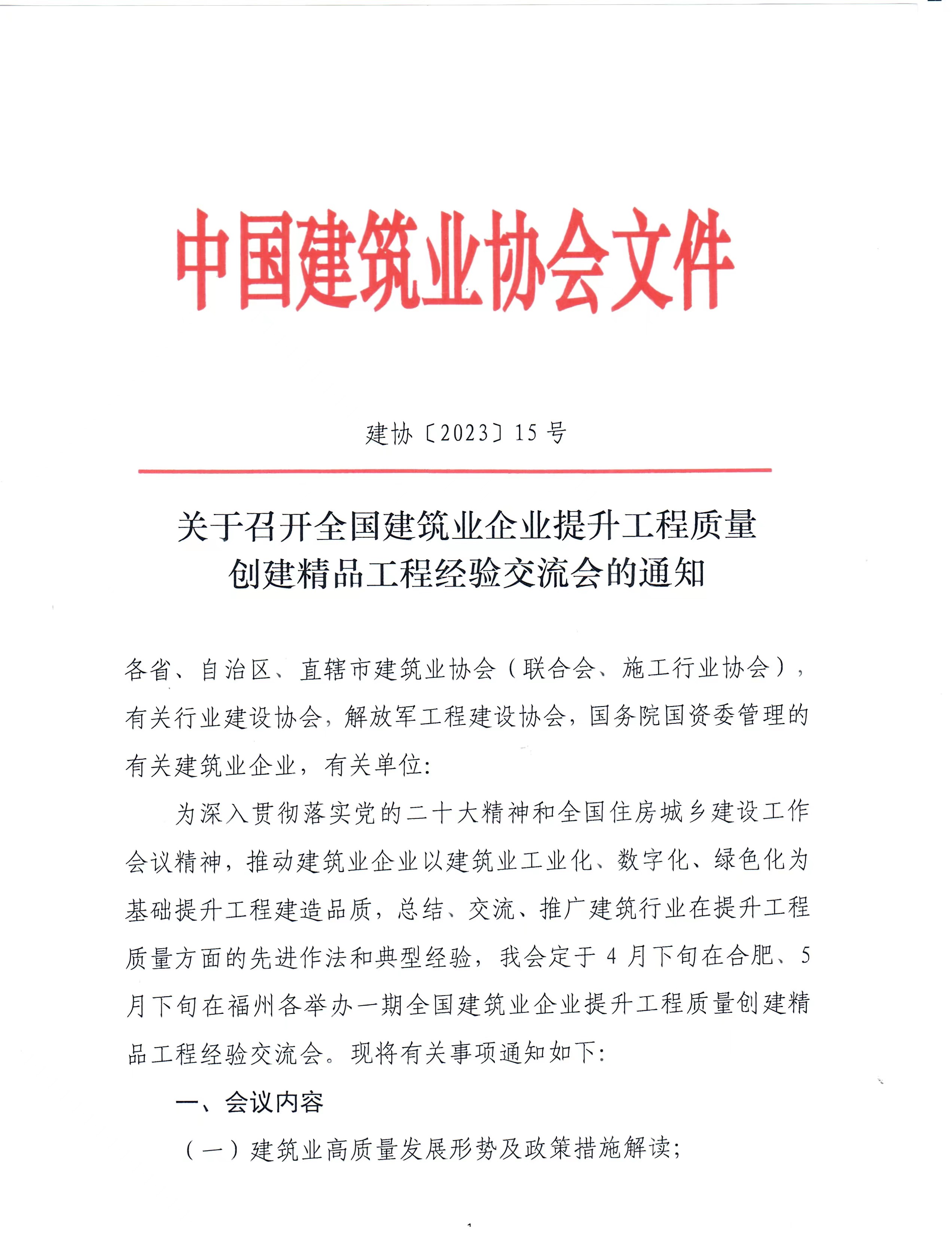 為深入貫徹落實黨的二十大精神和全國住房城鄉建設工作會議精神,推動建筑業企業以建筑業工業化、數字化、綠色化為基礎提升工程建造品質,總結、交流、推廣建筑行業在提升工程質量方面的先進作法和典型經驗,我會定于4月下旬在合肥、5月下旬在福州各舉辦一期全國建筑業企業提升工程質量創建精品工程經驗交流會。(第一期合肥會議已成功召開,第二期福州會議正在積極報名中。)現將有關事項通知如下: