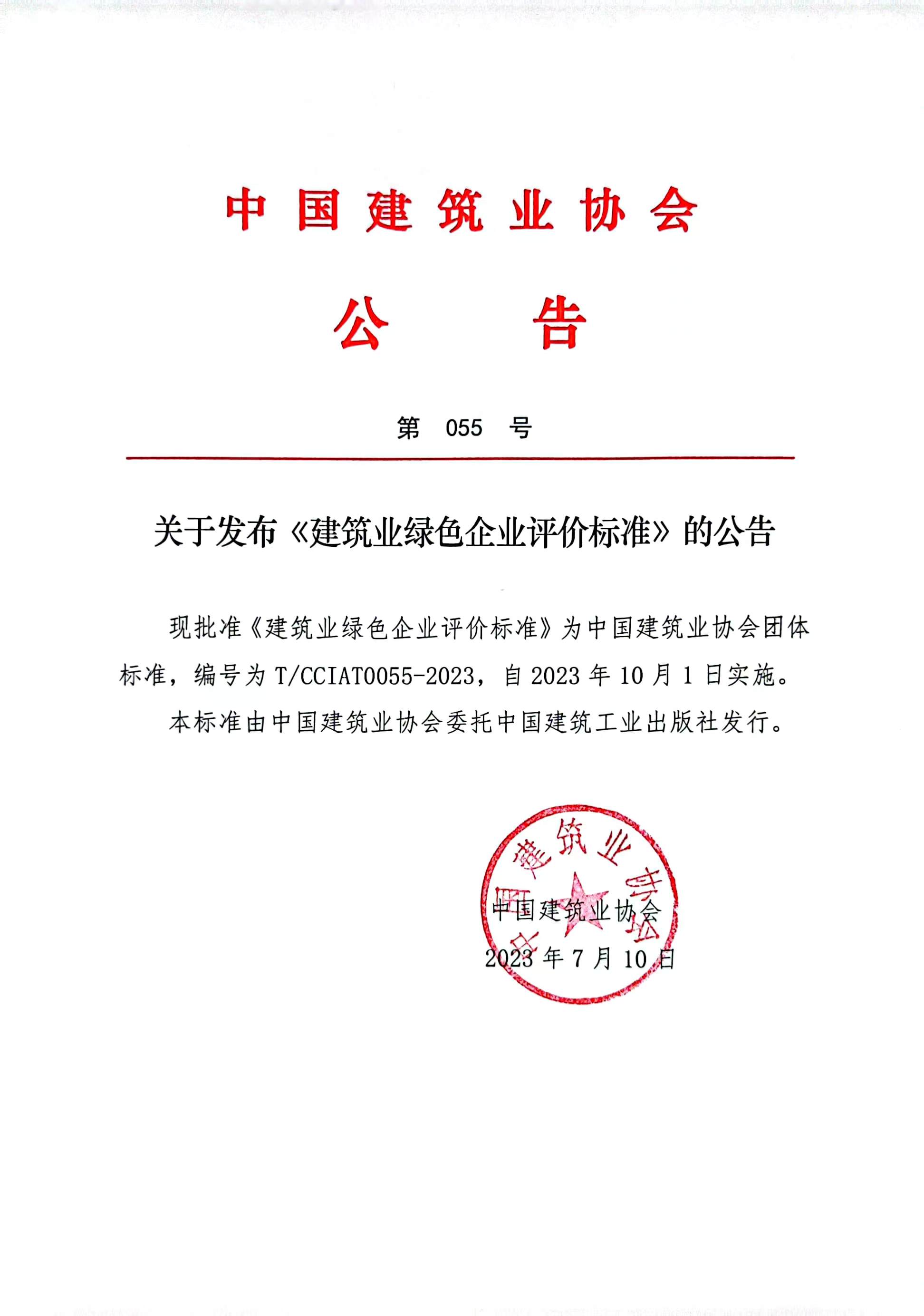 關于發(fā)布《建筑業(yè)綠色企業(yè)評價標準》的公告