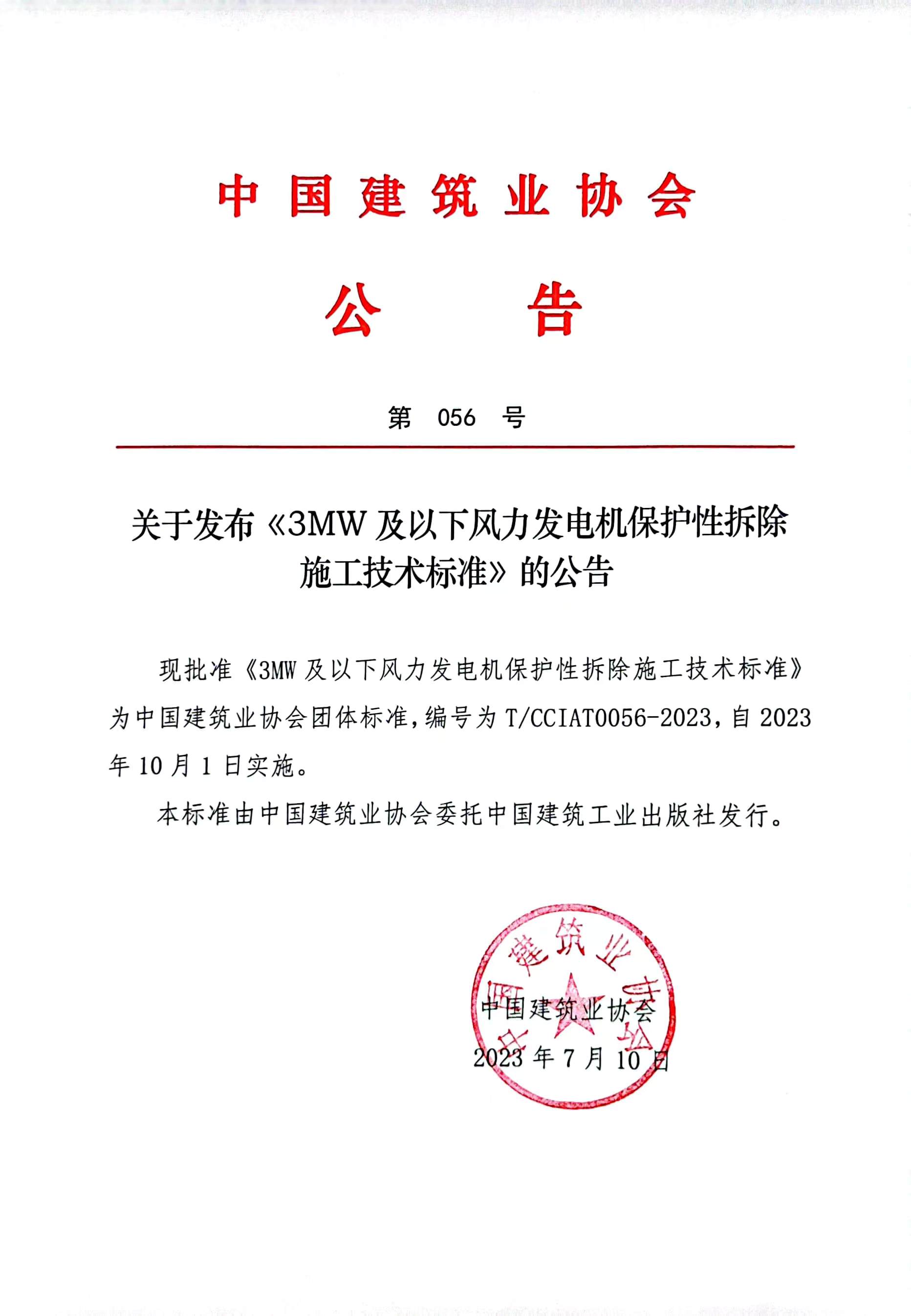 關于發(fā)布《3MW及以下風力發(fā)電機保護性拆除施工技術標準》的公告