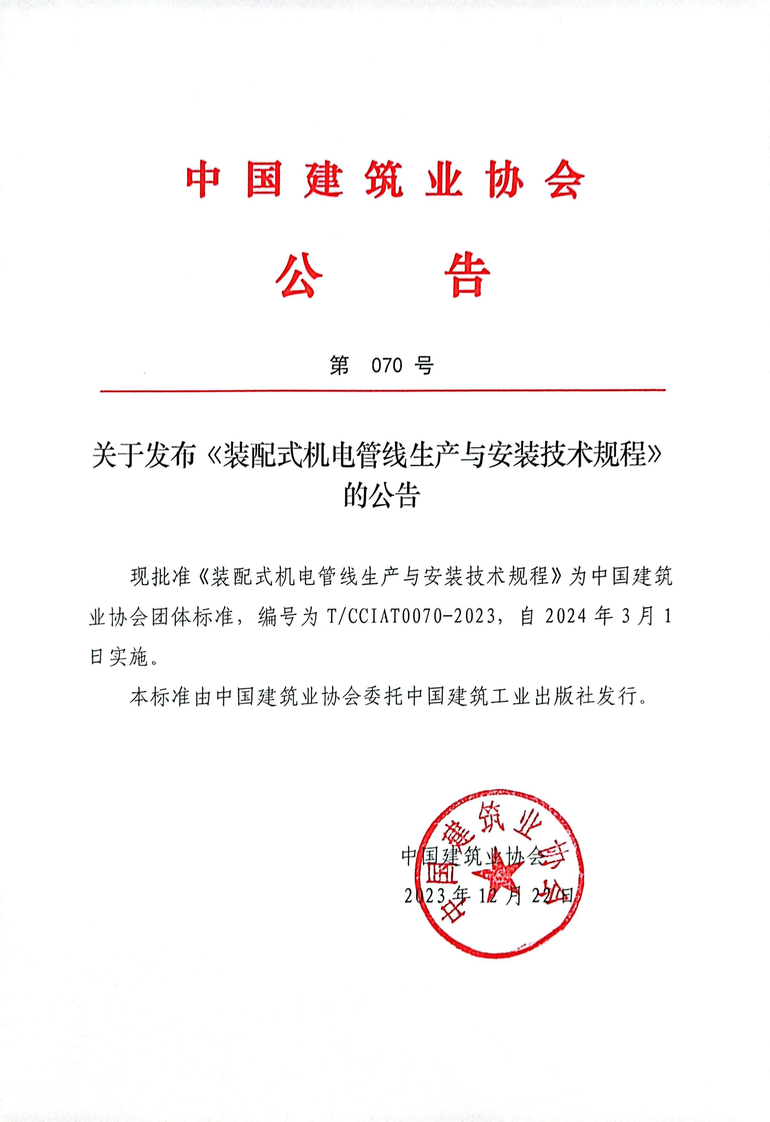 關于發布《裝配式機電管線生產與安裝技術規程》的公告