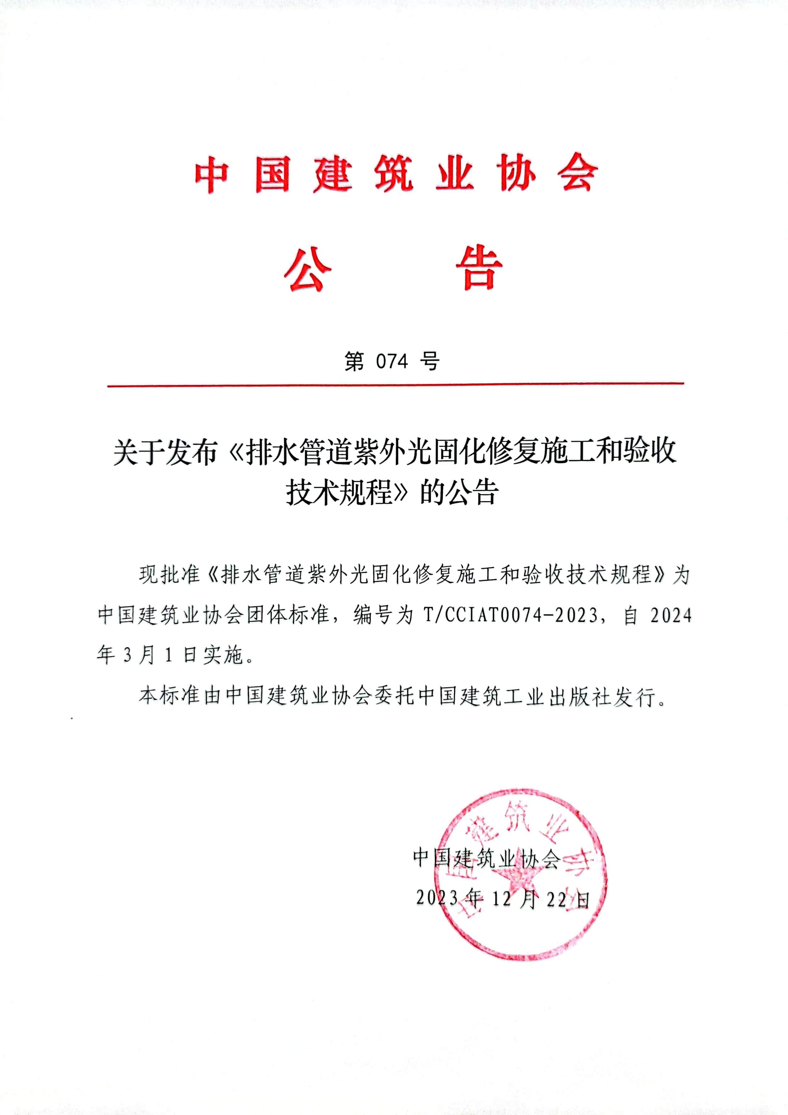 關(guān)于發(fā)布《排水管道紫外光固化修復(fù)施工和驗收技術(shù)規(guī)程》的公告