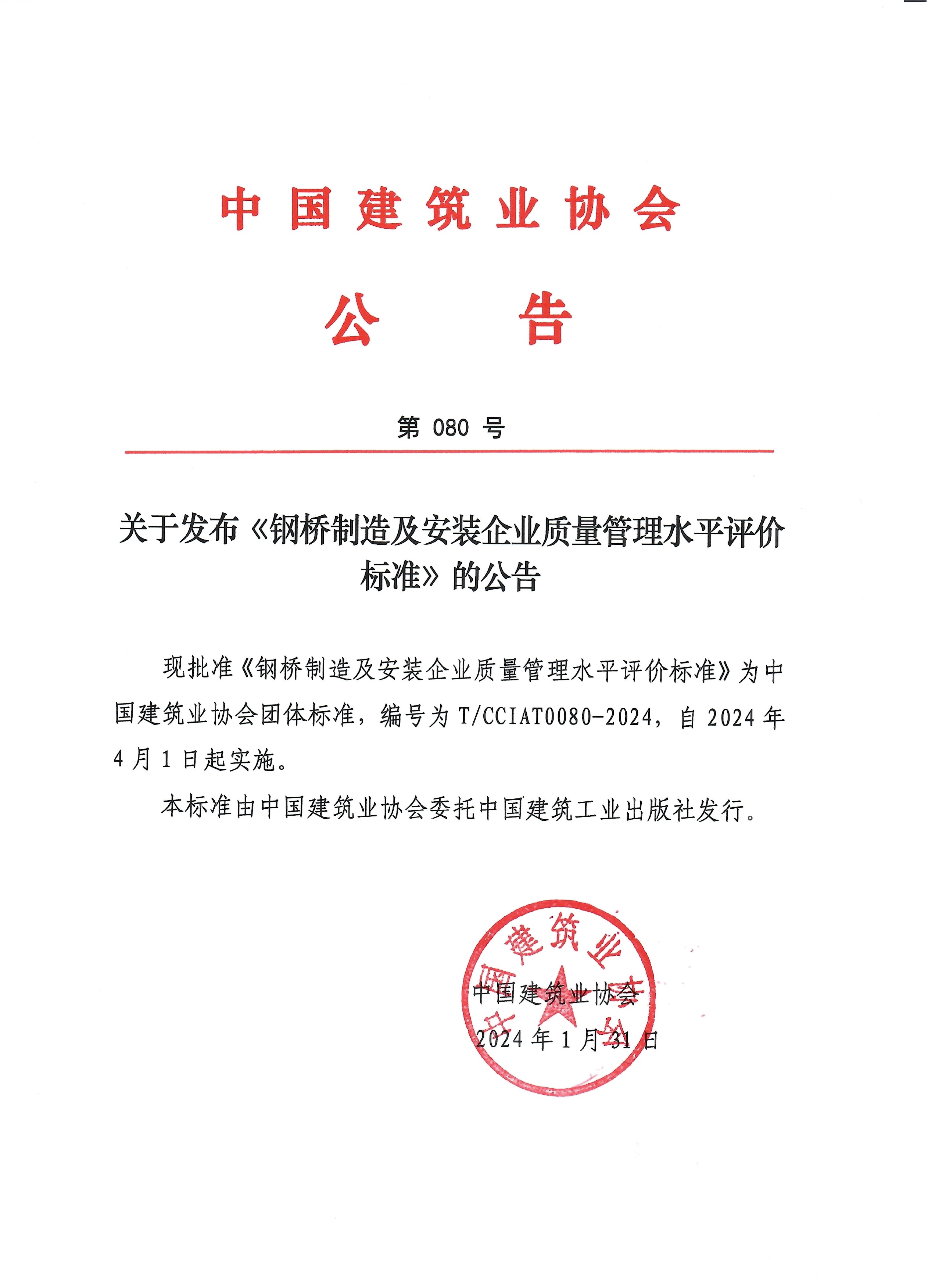 關(guān)于發(fā)布《鋼橋制造及安裝企業(yè)質(zhì)量管理水平評價標(biāo)準(zhǔn)》的公告