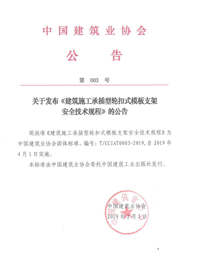 關于發布《建筑施工承插型輪扣式模板支架安全技術規程》的公告