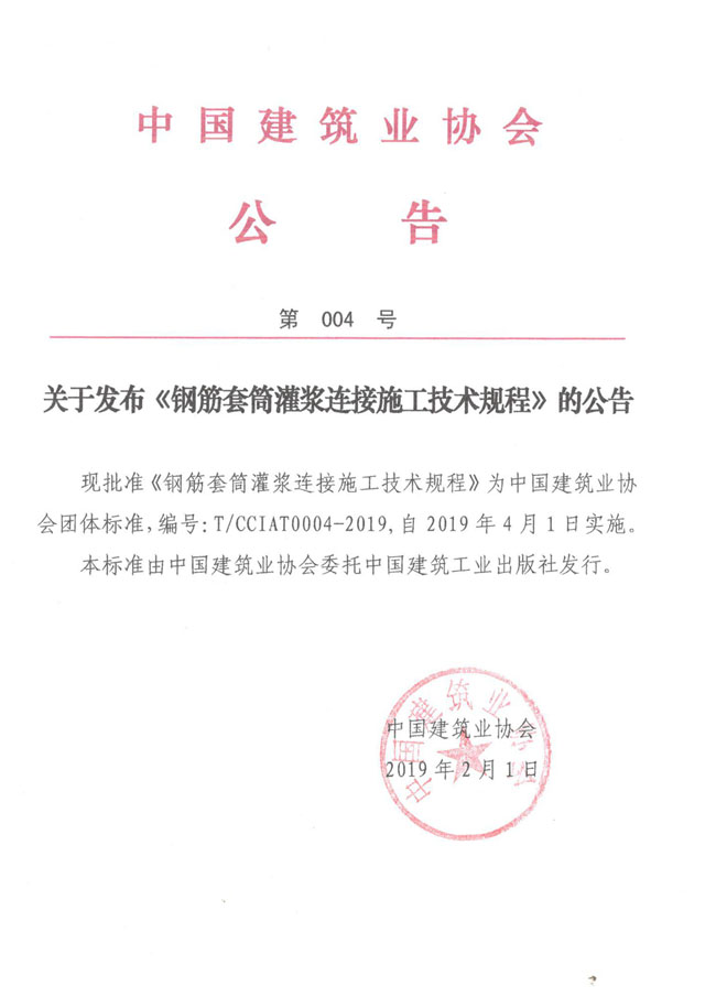 關于發布《鋼筋套筒灌漿連接施工技術規程》的公告
