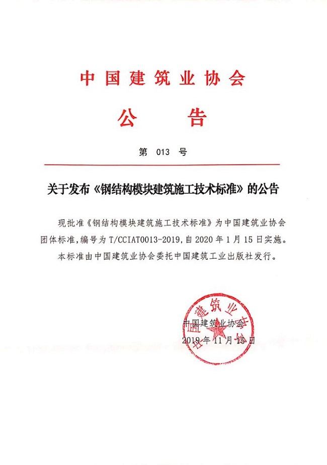 關于發布《鋼結構模塊建筑施工技術標準》的公告