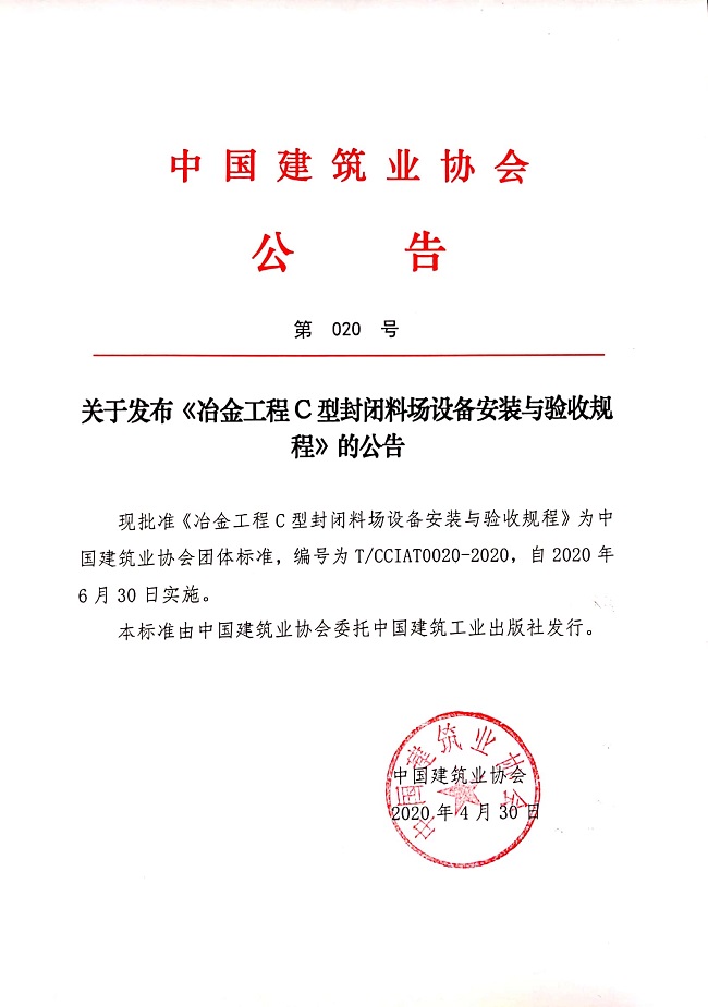 關(guān)于發(fā)布《冶金工程C型封閉料場(chǎng)設(shè)備安裝與驗(yàn)收規(guī)程》的公告