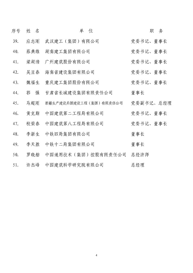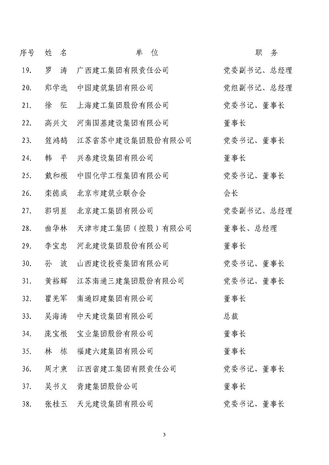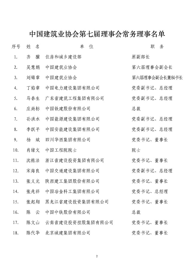 各省、自治區、直轄市建筑業協會(聯合會、施工行業協會),有關行業建設協會,解放軍工程建設協會,國資委管理的有關建筑業企業,本會單位會員: 我會于2020年8月28日召開了七屆一次理事會,會上無記名投票選舉產生了第七屆理事會常務理事51名。現將常務理事名單予以公布。