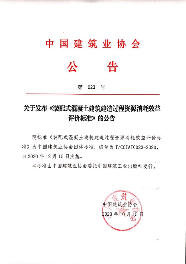 關(guān)于發(fā)布《裝配式混凝土建筑建造過(guò)程資源消耗效益評(píng)價(jià)標(biāo)準(zhǔn)》的公告