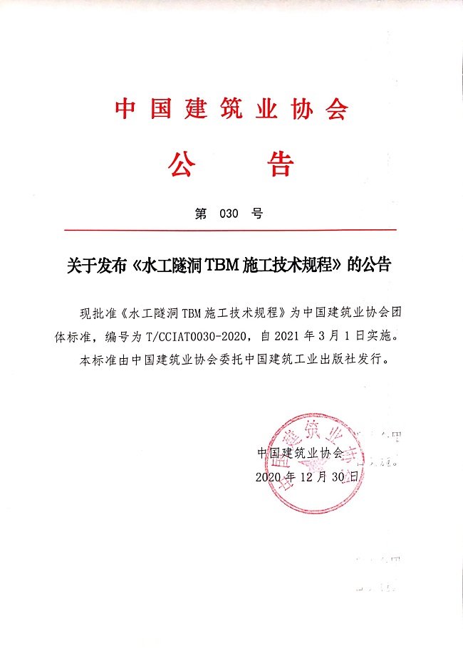 關于發布《水工隧洞TBM施工技術規程》的公告