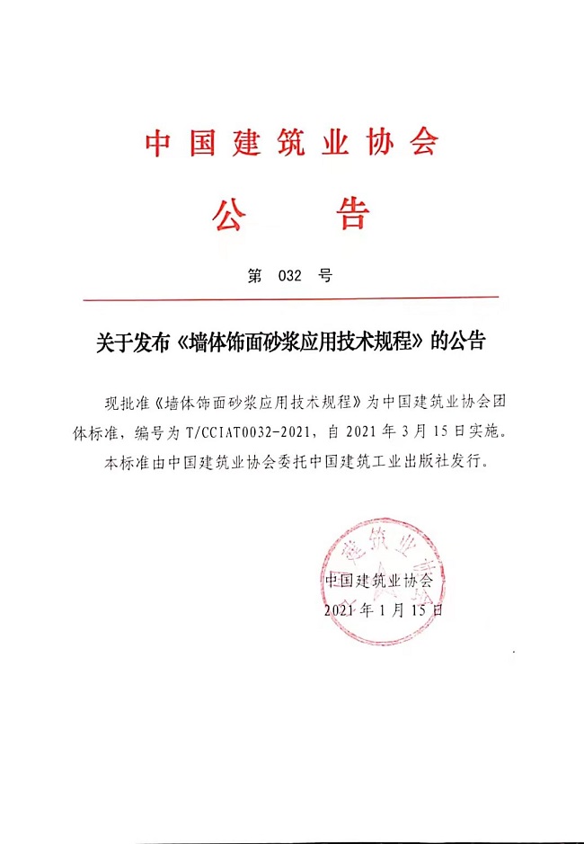 關于發(fā)布《墻體飾面砂漿應用技術規(guī)程》的公告
