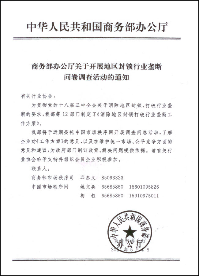 商務(wù)部辦公廳于5月4日發(fā)出《關(guān)于開展地區(qū)封鎖行業(yè)壟斷問卷調(diào)查活動的通知》,將委托中國市場秩序網(wǎng)開展問卷調(diào)查,請廣大會員單位積極參加。