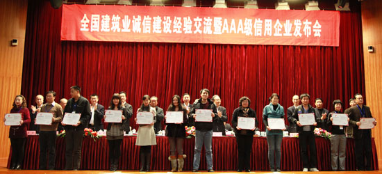1月17日,中國建筑業協會在京召開建筑業企業誠信建設經驗交流暨第二批建筑業AAA級信用企業發布會。北京城建集團有限責任公司等114家建筑業企業榮獲2010年度“全國建筑業AAA級信用企業”稱號。