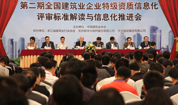會上,特級資質標準編寫專家徐和麟、邱巖分別就《施工總承包企業特級資質標準實施辦法》和《施工總承包企業特級資質信息化考評標準》進行了詳細的解讀,并對相關問題進行現場答疑。中天建設集團、四川華西集團、中國水利水電二局、中建一局集團建設發展有限公司等五家建筑企業介紹了本企業信息化建設的經驗; 杭州新中大軟件股份有限公司、北京華建互聯科技發展有限公司分別介紹了建筑企業信息化技術開發與應用情況。會議現場氣氛熱烈,企業學習熱情高漲,達到了預期效果。