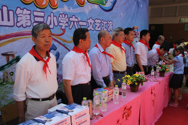 花園小學的少先隊員們給遠道而來的貴賓敬獻紅領巾