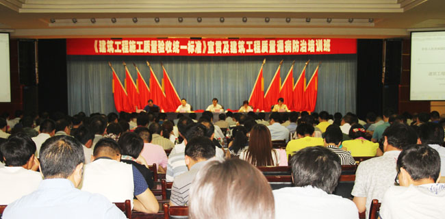 為貫徹落實(shí)住房和城鄉(xiāng)建設(shè)部新頒《建筑工程施工質(zhì)量驗(yàn)收統(tǒng)一標(biāo)準(zhǔn)》,有效防治工程質(zhì)量常見問題,提高工程質(zhì)量管理水平,中國(guó)建筑業(yè)協(xié)會(huì)和陜西省建筑業(yè)協(xié)會(huì)于5月29~30日在西安聯(lián)合舉辦了《建筑工程施工質(zhì)量驗(yàn)收統(tǒng)一標(biāo)準(zhǔn)》宣貫及建筑工程質(zhì)量通病防治培訓(xùn)班。陜西省建筑業(yè)協(xié)會(huì)許龍發(fā)會(huì)長(zhǎng)、向書蘭秘書長(zhǎng),中國(guó)建筑業(yè)協(xié)會(huì)景萬副秘書長(zhǎng),《建筑工程施工質(zhì)量驗(yàn)收統(tǒng)一標(biāo)準(zhǔn)》主要起草人、中國(guó)工程建設(shè)監(jiān)理協(xié)會(huì)張?jiān)睍?huì)長(zhǎng)出席開班儀式。來自陜西省及周邊省市的工程質(zhì)量監(jiān)督站和建筑施工企業(yè)的質(zhì)量、技術(shù)、管理人員400余人參加了培訓(xùn)。