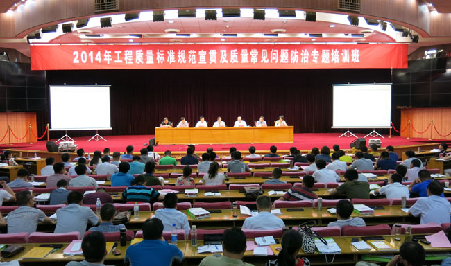 為強化全員質量意識,提高工程建設標準規范的執行力度,有效防治工程質量常見問題,促進工程質量管理水平穩步提高,受住房城鄉建設部工程質量安全監管司委托,中國建筑業協會于6月17~20日在青島舉辦了2014年第二期工程質量標準規范宣貫及質量常見問題防治專題培訓班。住房和城鄉建設部工程質量安全監管司工程質量監管處廖玉平處長、中國建筑業協會副會長兼秘書長吳濤、山東省建管局都昌林副局長、山東省建筑業協會王金玉會長、青島市建筑業協會劉昕光會長及有關專家出席開班儀式。來自山東、重慶、江蘇、新疆等25個省市工程質量監督站和建筑施工企業的質量、技術、管理人員共1100余人參加了培訓。