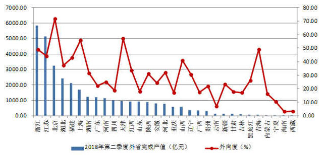 圖4 2018年上半年各地區跨省完成的建筑業總產值及外向度