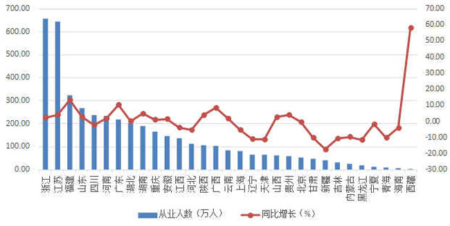 2018年上半年,全國建筑業從業人數超過百萬的地區共15個。浙江、江蘇依然是從業人數大省,人數分別達到658.04萬人和643.60萬人。福建、山東、四川、河南、廣東、湖北等6省從業人數均超過200萬人。與上年同期相比,16個地區的從業人數增加,其中,增加人數最多的是福建,增加38.15萬人;15個地區的從業人數減少,其中,減少最多的是新疆,減少8.76萬人。從業人數增幅最大的是西藏,達到58.09%;增幅最小的是新疆,下降了17.44%(圖5)。