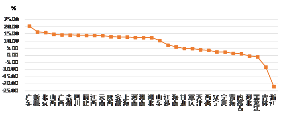 從各地區建筑業總產值增長情況看,有 27 個地區的建筑業總產值較上年同期有不同幅度的增長。其中,廣東、新疆、北京的增幅均超過 15%。有 4個地區出現負增長,其中,浙江出現了 超過20% 的負增長(圖 2)。
