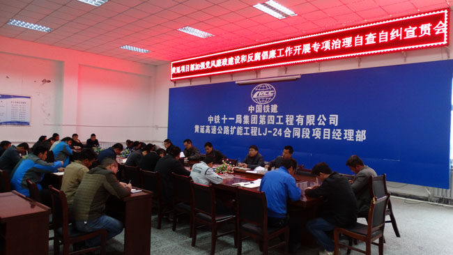 項目黨工委書記王健首先傳達了公司黨委下發的關于加強黨風建設和反腐倡廉工作開展專項治理自查自糾工作實施方案,決定采取深入學習教育等措施,對項目領導班子成員也建立專項治理自查自糾的測評表,要求項目全體人員對項目領導班子測評打分,為的是給全體職工做表率,讓全體職工做好監督工作。還學習了習近平總書記關于作風建設、紀律建設的講話精神,要對項目全體人員在動員、在部署。建全臺帳,按時上報資料。要求項目領導班子和關鍵崗位人員必須深刻領會和貫徹習總書記重要指示精神,提高對項目黨風建設和反腐敗工作重要性的認識,為抓好項目黨風建設和反腐倡廉工作,推動項目持續穩定提供牢固的思想基礎和保障。