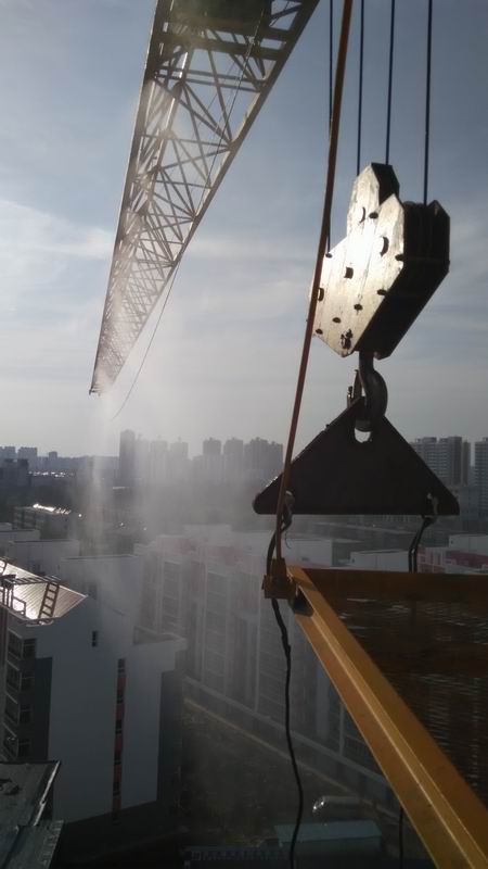 這座塔吊式噴淋設施是怎么工作的呢?該項目的管理人員告訴記者,這一提議來自市安監站領導,工作原理是將水管放置于塔身、塔臂的內側,再在塔臂的橫向水管上設置若干個噴頭,通過加壓設備將水輸送到水管里,水通過噴頭再噴射出來,從而達到為工地降塵的目的。此舉不僅節約了水資源,還可以通過塔臂的移動實現空中和地面全面降塵的目的,彌補普通的降塵方式只能起到地面降塵效果的缺陷。據悉,該項目部每天早、中、晚都會對工地進行高空噴灑降塵,大氣污染嚴重時,還加密噴灑頻次。