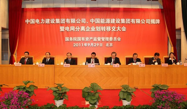 9月29日,中國電力建設集團有限公司在京正式掛牌成立。揭牌儀式暨電網分離單位劃轉移交大會在國資委舉行,同時揭牌的還有中國能源建設集團有限公司。這標志著歷時多年的電網主輔分離改革重組取得重大進展,標志著中央電力企業布局結構調整邁出重要步伐。國資委主任、黨委書記王勇、國家發改委副主任彭森出席會議并講話,電監會、財政部、國家能源局、工商總局等有關部委負責同志出席,國資委副主任邵寧宣讀了國務院有關批復,國資委副主任金陽宣布了有關人事任命。中國電力建設集團有限公司董事長范集湘代表集團作了發言。