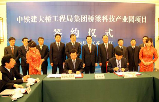 4月7日,中鐵建大橋工程局目前投資規模最大的橋梁科技產業園項目協議簽約儀式在江蘇省靖江市舉行,大橋工程局集團董事長、總經理姜永軍與靖江市委副書記、市長趙葉在熱烈的掌聲中簽字并互換協議,標志著該項目正式啟動。