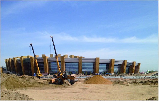 目前,該工程主體、鋼結構、金屬屋面、金屬幕墻等全部完成,正在進行室內裝修及室外硬化工作;工程計劃于2014年7月30日完工,8月30日完成竣工驗收。