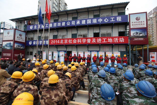 北京建工集團副總經理蘭慧賓表示,今年的社科普及進工地活動主題鮮明,緊扣社會主義核心價值觀,活動一定會在建工集團10萬名建設者中產生廣泛影響,促進大家在本職崗位踐行社會主義核心價值觀,加快和諧城市建設,讓城市更加宜居。他指出,近年來北京建工集團在所有的施工現場都開辦了“農民工夜校”,讓農民工兄弟學企業文化、學文明禮儀、學安全知識、學施工技術、學法律知識、學科普知識,做“有知識、有能力、有紀律、有形象”的外施員工,成長為北京建工集團不在冊的企業員工。此次社科普及進工地活動,不僅為我們農民工兄弟送來了社科知識,還帶來了“工地書屋”這個長效機制,大大豐富了農民工兄弟的業余文化生活;特別是這次社科聯把黨的群眾路線教育實踐活動落到實處,大力弘揚社會主義核心價值觀,讓農民工兄弟說出了自己的夢想,讓北京建工集團員工代表用自己踐行社會主義核心價值觀的故事激勵大家,旗幟鮮明,主題明確,意義深遠。為此,他表態,一定將社科普及進工地的精神落實到日常管理中,大力弘揚和踐行社會主義核心價值觀,打造領先文化,關心農民工兄弟的生活、工作和學習,將建工集團“建樓育人”的企業宗旨發揚光大。同時,他希望北京社科聯能夠在今后將更多的科學文化知識送進建筑工地,將“愛國、創新、包容、厚德”的北京精神帶進工地,將“富強、民主、文明、和諧;自由、平等、公正、法治;愛國、敬業、誠信、友善”的社會主義核心價值觀帶進工地,團結引領廣大農民工兄弟一道實現“偉大中國夢”。