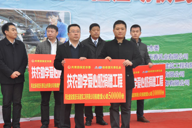2015年1月18日,共青團保定市委聯合河北新希望天香乳業有限公司組織的保定市“扶農助學”愛心奶捐贈工程啟動儀式在市青少年宮舉行。此次活動上,河北建設集團下屬的子公司——天辰公司熱心捐款5萬元購買愛心奶,在體現了高度的社會責任感的同時,又為奶農和希望小學的孩子們送去社會的關懷和冬天的溫暖。