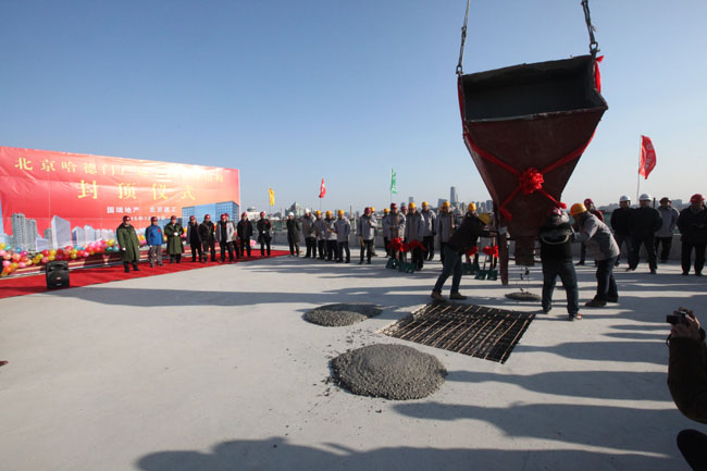 2015年12月3日上午10時18分,在繁華的崇文門商圈東南一角,一座宏偉大氣的高樓拔地而起,由北京國瑞地產(chǎn)開發(fā)、北京建工四建施工的北京哈德門廣場工程(東城區(qū)崇文門路口東南角0138-607地塊商業(yè)金融項(xiàng)目)澆筑了最后一斗混凝土,這標(biāo)志著該工程主體結(jié)構(gòu)全面封頂。