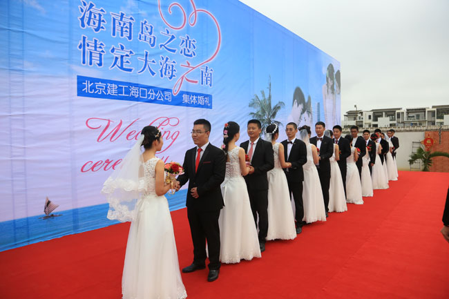 說起舉辦這次集體婚禮的初衷,北京建工四建海南分公司經(jīng)理劉磊介紹“四建公司自2009年進入海南市場,從一個項目部,30多名員工,一步步發(fā)展到今天,8個整建制項目部,307名員工,18項在施工程,總建筑面積超260萬平方米。其中青年職工201人,占到職工總數(shù)的67%,尤其是2009-2010年進入海南時期的青年員工,現(xiàn)如今均已到成家立業(yè)的年齡,他們是北京建工在海南發(fā)展的排頭兵,他們將自己6年的青春貢獻給了海口國興大道兩側(cè)的建筑物,留下了‘國興大道建工街’的美名。分公司領(lǐng)導(dǎo)班子感念青年人的無悔付出,集體決定為他們組織一場難忘的集體婚禮,以增加青年職工的企業(yè)歸屬感,建立員工‘愛家就是愛企業(yè),愛企業(yè)就是愛家’的企業(yè)認同感。”