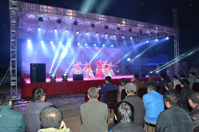 演出開始前,河北建設集團黨政辦公室副主任、乾元農業開發公司總經理朱國發致辭。帶著領導的關心與問候,帶著對阜平縣父老鄉親和一線員工的溫馨祝福,慰問演出正式開始。參加此次此次慰問演出的演員全部來自保定市藝術團,演員陣容強大,節目編排合理,內容豐富,形式多樣,囊括了歌舞、戲曲、相聲等藝術形式。在冰冷的秋雨之中,演員的精彩表演與互動得到了臺下觀眾的積極響應和熱情的掌聲,演出現場的氣氛非常火爆。演出達到了慰問阜平縣父老鄉親和該集團一線員工的預期效果。