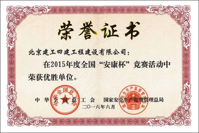 近日,由中華全國總工會、國家安全生產(chǎn)監(jiān)管管理總局聯(lián)合舉辦的2014-2015年度全國“安康杯”競賽落下帷幕,北京建工四建工程建設有限公司被授予2014-2015年度全國“安康杯”競賽優(yōu)勝單位榮譽稱號,系該公司歷史上首次獲此殊榮。