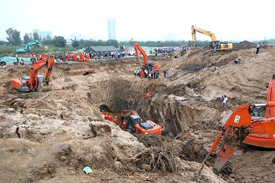 11:05分,王鑫帶領工地10余名工作人員和5臺挖掘機、2臺型裝載機,趕到事發(fā)現(xiàn)場,大家聽從消防人員的統(tǒng)一安排,立刻發(fā)動機器沿著被困男童豎井的東側(cè)進行分段流水挖土。此時,項目執(zhí)行經(jīng)理呂斌、生產(chǎn)副經(jīng)理王鑫立刻扮演成指揮員,他倆繃緊心弦,一邊指揮者現(xiàn)場的工程機械作業(yè),一邊注視著救援人員的安全。
