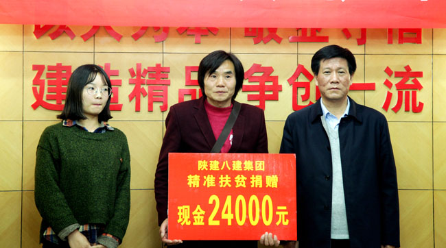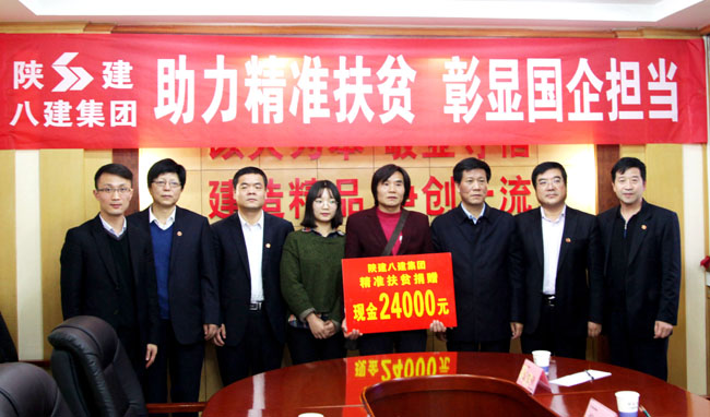 10月25日下午,陜建八建集團(tuán)在西安舉行了“助力精準(zhǔn)扶貧,彰顯國企擔(dān)當(dāng)”捐贈儀式,集團(tuán)黨委書記、董事長劉鵬慧代表企業(yè)為藍(lán)田縣輞川鎮(zhèn)七安子村貧困戶朱國亮捐贈了2.4萬元的危房改造資金 。西安市碑林區(qū)委宣傳部副部長、文明辦主任劉玉參加見證活動。