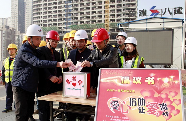 11月22日,陜建八建集團直屬項目部在國家大學科技園科創孵化基地項目部開展“獻愛心•傳真情”募捐活動,工地上的50名干部職工踴躍為該項目勞務公司的一名肝癌患者32歲的湖北籍木工工長楊全偉募捐善款4320元,助力他早日戰勝病魔。此次愛心捐款活動,不僅體現了八建集團“一方有難,八方支援”的一貫作風,更是為楊全偉這樣的有功之臣樹立起戰勝病魔、回到工作崗位的信心。(建筑行業信息宣傳工作通訊員:何文博 陳璽龍 供稿)