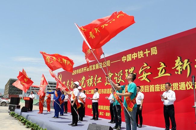 近日,瑞安市經(jīng)濟開發(fā)區(qū)發(fā)展總公司——中國中鐵十局“不忘初心黨旗紅 建設(shè)瑞安立新功”主題黨日活動暨中鐵十局瑞安市丁山二期圍墾區(qū)市政道路及附屬配套PPP項目首座橋梁貫通儀式舉行。來自瑞安市經(jīng)濟開發(fā)區(qū)、經(jīng)濟開發(fā)區(qū)發(fā)展總公司、中鐵十局、中鐵十局投資公司、中鐵十局五公司以及項目公司、項目部的90余名黨員、工人、團員代表參加活動,共同慶祝該工程首座橋梁順利貫通。