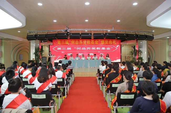 10月10日上午,第三屆“何品蘇獎教基金”頒獎典禮在東陽市實驗幼兒園藝海劇院隆重舉行。東陽市委常委、宣傳部長蔣令樹,東陽市副市長陳巧錦,市教育局局長顧在響,以及東陽市外國語學校校長蔣曉東、市外國語小學校長盧雁紅、市實驗幼兒園園長沈群英,歌山控股集團董事長兼總裁何向全,浙江歌山置業有限公司董事長、何品蘇獎教基金會名譽理事長何向健出席典禮并為獲獎教師頒獎。