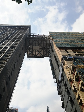 深圳海境界家園二期項目BC連廊是鋼桁架結構形式,連廊長26m,寬22m,高16m,總重量近千噸,屬超危大工程,也是本項目施工過程中最大的重難點,如此重量和高度的提升尚屬首次,沒有先例,分公司項目部高度重視,為了確保連廊吊裝一次到位,項目部成立以項目經理為組長,項目總工為副組長,協調組長、技術組長、安全組長、吊裝焊接組長、監測監控組長、保障組長組成的吊裝小組。施工過程中,多次對鋼結構設計進行優化、深化,對焊接質量進行探傷試驗,對鋼結構實體重量,預埋吊點承重,進度節點,吊裝時間,天氣預報等全方位進行綜合考慮,多次BIM演示,實戰演練,受到業主、監理、設計一致認可,均達到設計要求。僅吊裝內部交底達三次以上,在吊裝的前一天,在安長彪副總工的見證下,又組織相關人員進行一次現場交底,在原有交底基礎上做了補充,將原監測頻次修改成10m、50m、80m三次過程監測。對吊裝過程要發生的位移、變形、監測、記錄等問題進行預判,統一處理意見。對每位組長的崗位流程進行口頭提問,確保人人心中有數。要求所有參與人員分工明確,協同作戰,一切行動聽指揮。確保吊裝萬無一失,平穩安全一次到位。