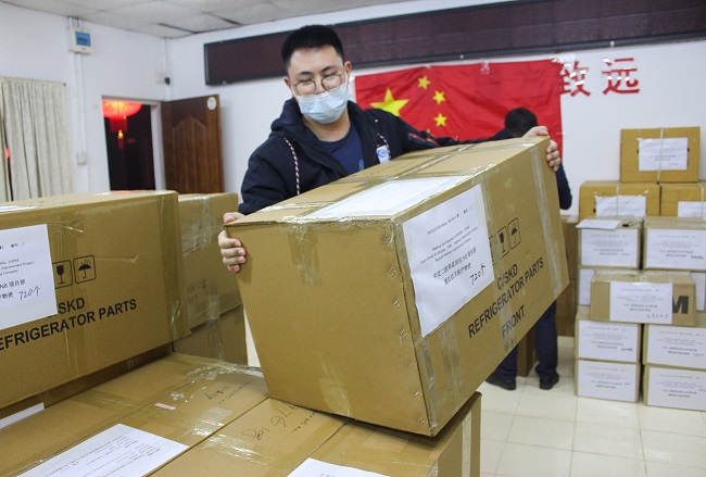 孟加拉N8改擴建項目7標工作人員搬運準備支援武漢的醫療物資。馬洪強 攝