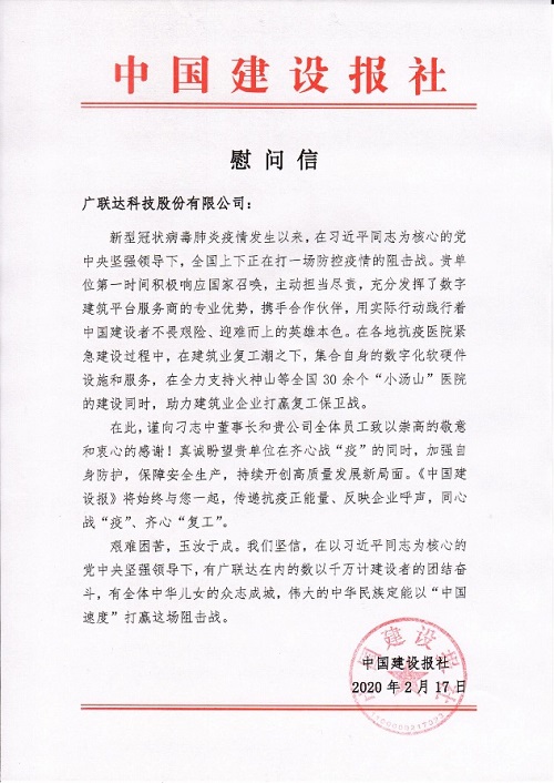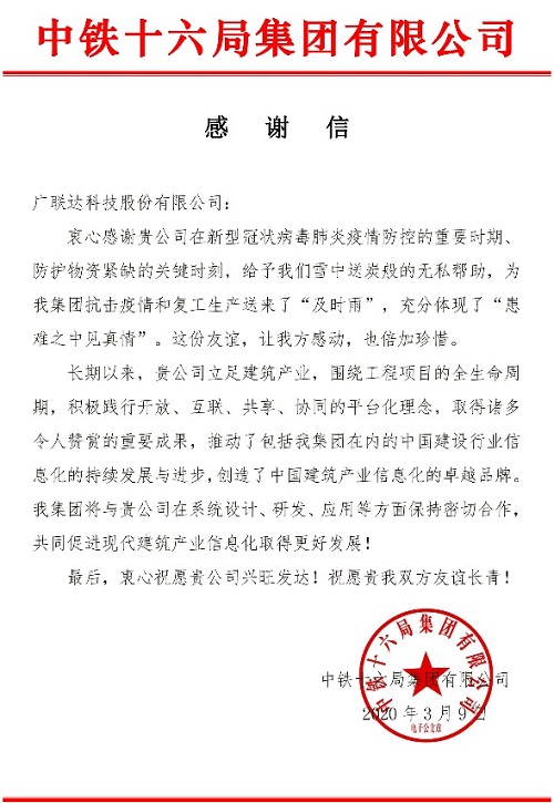 近期,由于在疫情防控期間對建筑業同仁的積極努力和大力協助,廣聯達陸續收到了來自各方的感謝信,受到中鐵十六局集團有限公司和中國建設報社等多家建筑行業同仁的一致好評。艱難困苦,玉汝于成,有千萬計建設者的團結奮斗,有全體中華兒女的眾志成城,偉大的中華民族定能以“中國速度”打贏這場狙擊戰。