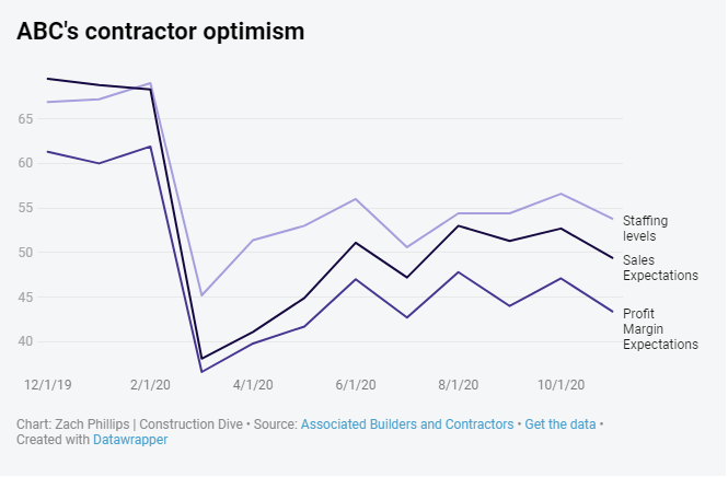 Associated Builders and Contractors assembles a monthly report of confidence in sales expectations, profit margin expectations and staffing expectations. A score above 50 indicates growth.