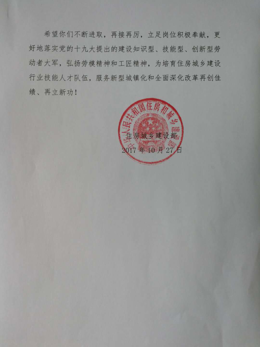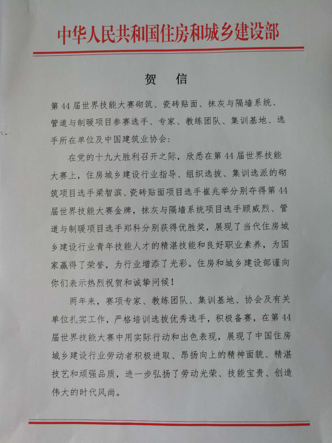 10月27日和25日,住房城鄉(xiāng)建設部部長王蒙徽、副部長易軍分別就部人事司關于第44屆世界技能大賽,我們中國建筑業(yè)協(xié)會建筑企業(yè)經(jīng)營和勞務管理分會在部人事司指導下組織選拔、集訓選派的建設行業(yè)選手參賽情況的簽報上作出批示,并以住房城鄉(xiāng)建設部名義向我會及獲獎選手、專家、教練團隊、集訓基地、選手所在單位發(fā)來賀信。賀信全文如下: